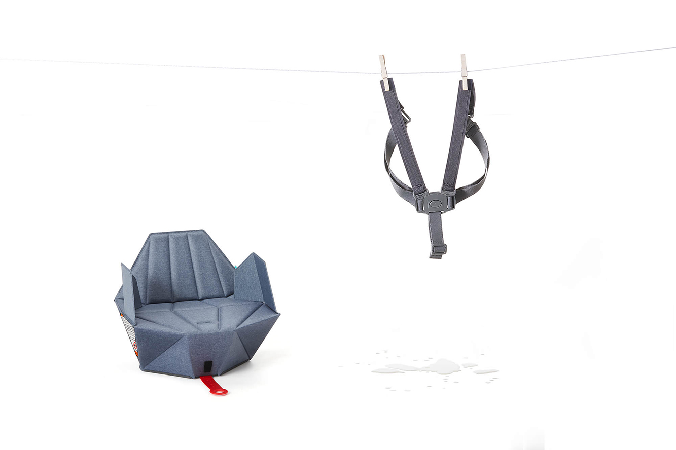Our booster’s origami structure is incredibly strong and safe. We were determined not just to meet the international safety standard for boosters (EN 16120:2014 and ASTM F2640) but also the standard for adult furniture (EN1728:2012). That meant pounding the booster with a 75kg weight – an average adult – 20,000 times to see when it broke. It didn’t.